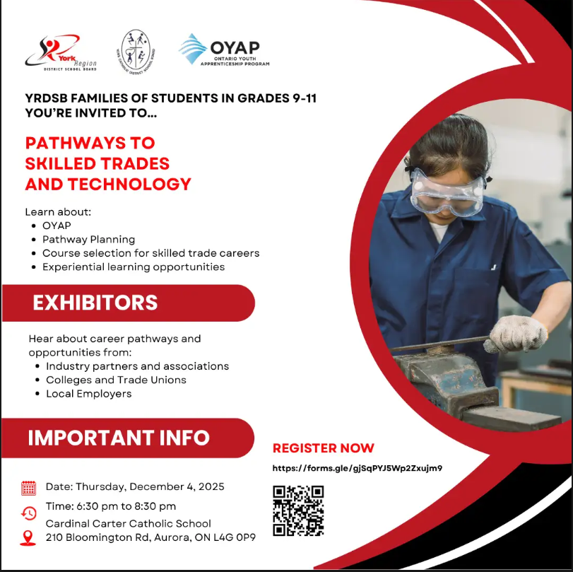 The Pathways Team in Curriculum & Instructional Services in collaboration with the York Catholic District School Board invites families of students in Grades 9-11 to attend a Skilled Trades and Technology Career Planning Information Night. The goal of this event is to provide students with an opportunity to learn about pathways in industries that are constantly innovating, on the cutting edge of emerging technologies, and making a critical difference in people’s lives.